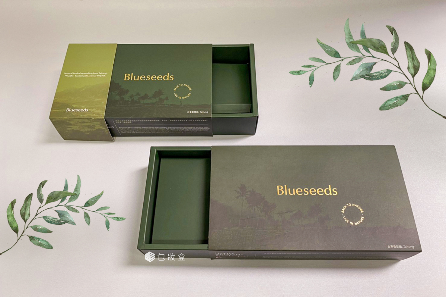 時常洗手忘記做好保養而手部乾燥龜裂,或者因為戴口罩而導 這些煩惱芙彤院都深深切切的同感啊!這次針對不同膚況/體質都能找到適合的清潔用品及保養品的禮盒,就是要獻給每一個認真防疫的無名英雄的你������ 材質:白卡,彩色印刷 類型:抽屜盒 為了你,我們栽培了一畝畝的香草田,實施自然農法,對土地最溫良,也對栽植香草的農人付出一樣真真切切的關懷,和對他們的社會處境的同理;因為我們同是社會裡、生態中的一份子,唯有共好才能生生不息。 而這個照顧防疫英雄禮盒的幕後推手之一還有包妝盒和包妝盒一起製作禮盒的過程也看見了這間公司的認真,自接洽開始便一直給予我們適宜的回饋和建議,像是針對罐裝產品、條狀式的乳霜產品各自應該如何組合以及保護,最後一起完成了產品的禮盒。 由於芙彤園的願景是促進自然生態及社會的生機盎然,踏實穩健地做對土地友善的事業,最後選擇了沈穩內斂的兩個深淺不同的綠色作為基底,套印上公司的品牌名稱,最後再以霧膜的盒套包裹住,成為送到顧客面前的樣子。我們希望也能夠讓每一位消費者感受到我們對自然及社會的溫柔,如同產品帶給你肌膚的滋潤。������ 希望大家繼續落實防疫新生活,平安健康������關注我們: https://www.blueseeds.com.tw 。