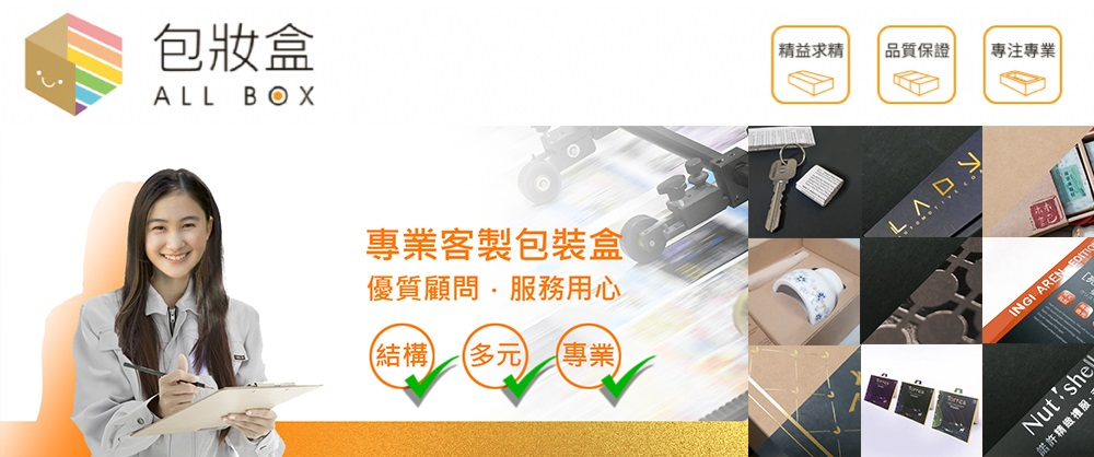 包妝盒(All Box)為一印刷設計公司提供專業彩盒印刷、客製化包裝盒(彩盒)、少量客製化包裝盒、原色包裝盒、現貨公版包裝盒、宅配運送外箱、現貨宅配紙箱印刷之專業製造商,擁有超過三十年的業界良好口碑以及豐富的國內外大廠OEM訂單經驗,許多客戶藉由我們的服務打入大的通路,如大潤發,阿里巴巴,Walmart,COSTCO, AMAZON, ALIBABA, Kmart, Target, Springs, and Sears.